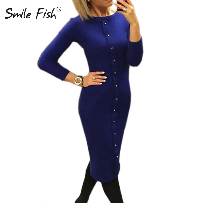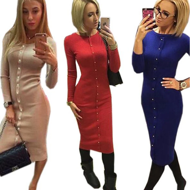 Work Office Women Dresses Party Autumn Winter Bodycon Midi Dress Robe Sheath Casual Buttons Knitted